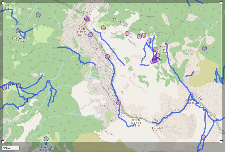 - Les secourus ont vu cette « trace » récente sur je ne sais quelle carte (pas OTM en tout cas qui n’est plus mis à jour depuis longtemps). Peu expérimentés, ils n’ont pas su lire le rendu de la difficulté (T5/T6) et de la visibilité renseignés par l’« hurluberlu » et ont vu là un chemin direct vers leur destination. Même sur place, ils n’ont pas renoncé à s’engager, rassurés peut-être par leur position GPS sur les pointillés.