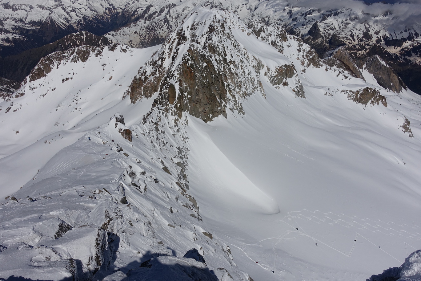 Depuis le sommet de la Maladeta, en regardant vers l’ouest. Donc on a le glacier de la Maladeta à droite. On voit en zoomant à milieu gauche quelqu’un qui sort du couloir de la rimaye.