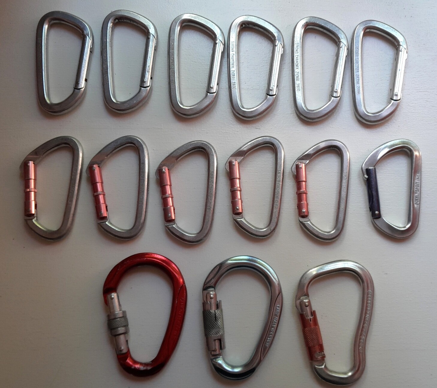 - 6 mousquetons simples Simond Zicral 2800, année 1988 (pouvant aussi intéresser des collectionneurs : Mousqueton - IALP Mountain Museums) : 30 € le lot,