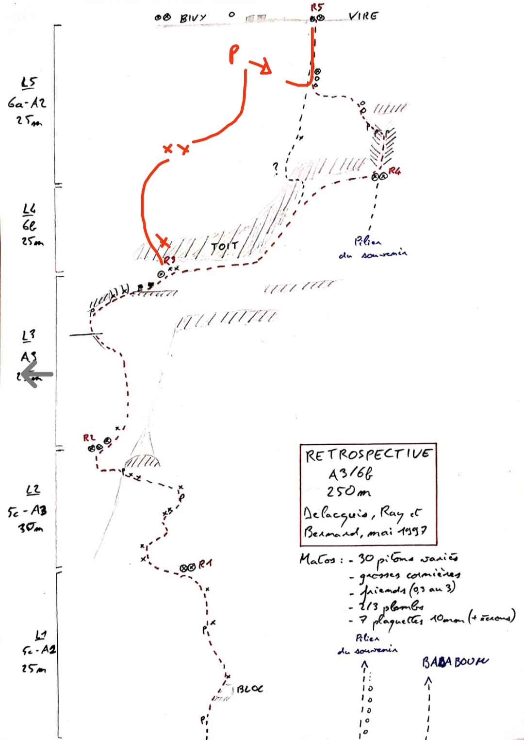 L5 traversée à droite puis tout droit dans la dalle. La dernière barre sous la vire de bivouac (pourrie) s’évite par une traversée descendante à droite pour rejoindre les qq mètres du pilier du souvenir avant le relais (délicat pour le second).