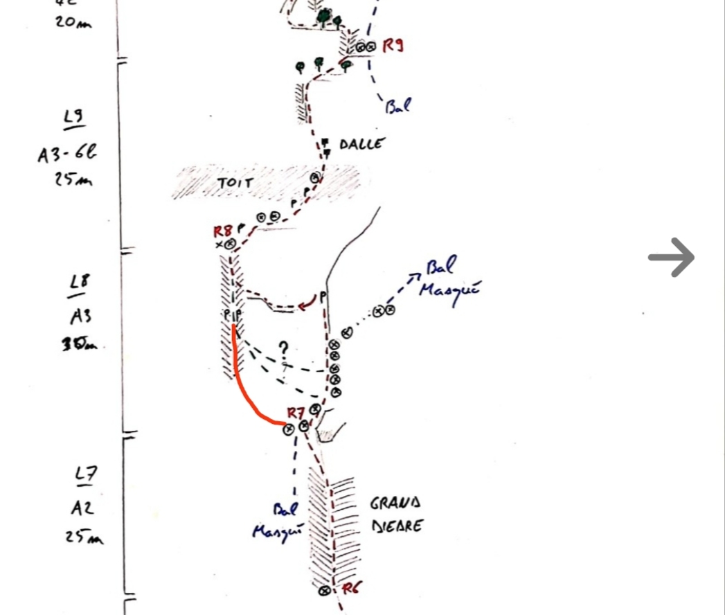 L8 Le pendule par le haut passe bien mais la voie originale part à gauche du relais ( sans monter dans bal masqué). On ne voit rien du relais, mais en se mettant en tension à gauche on voit les trous.