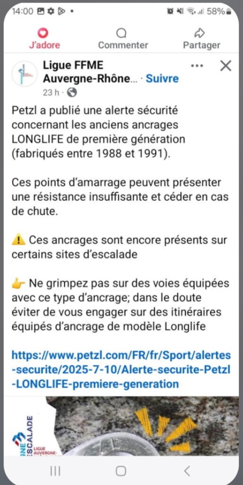 Le 10 juillet 2025, PETZL a publié une alerte de sécurité concernant les anciens spits LONGLIFE de 1ère génération (fabriqués entre 1988 et 1991), qui sont susceptibles de céder en cas de chute.