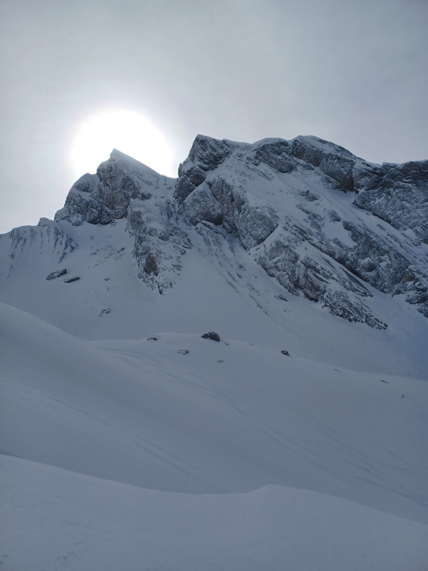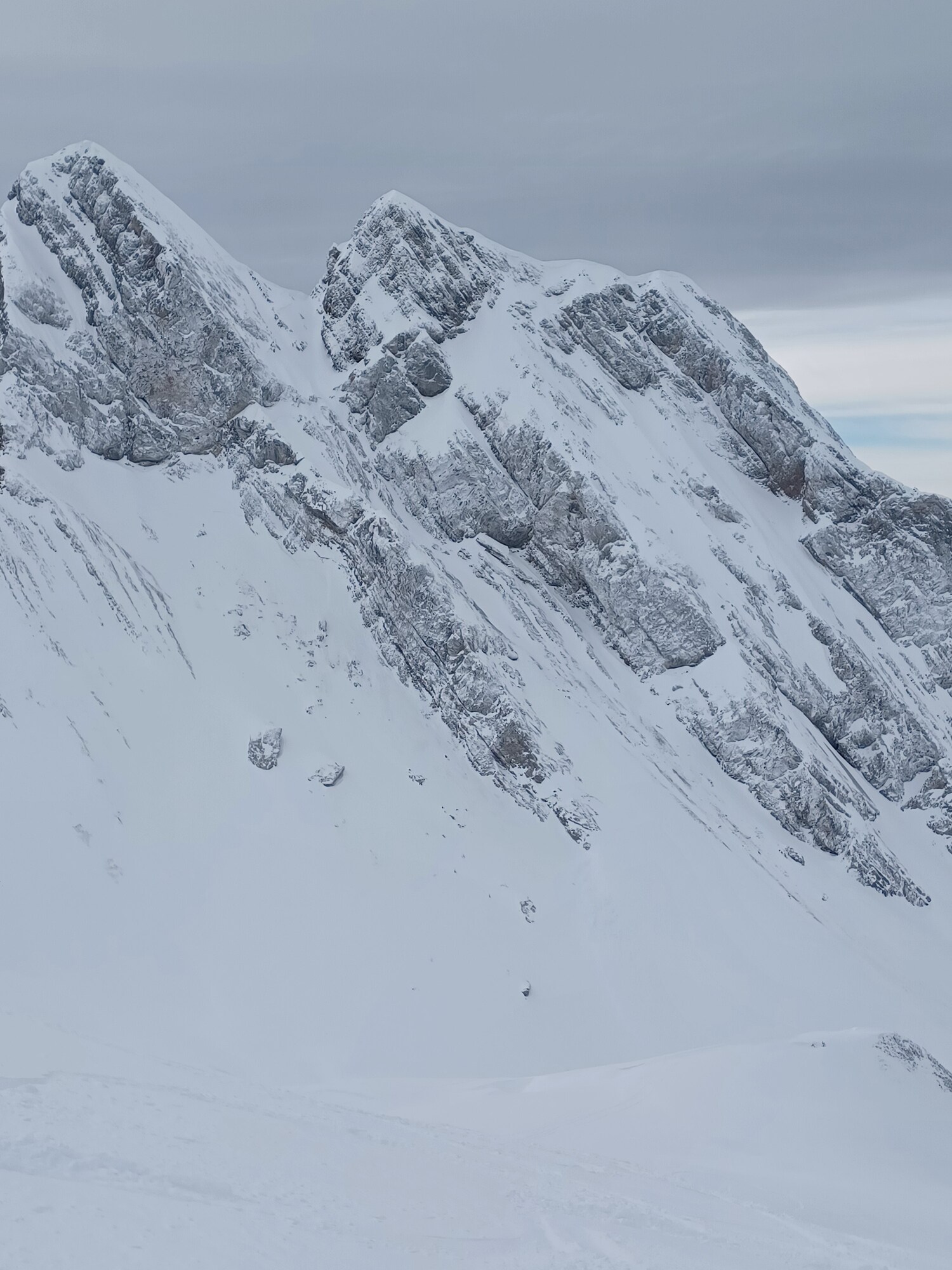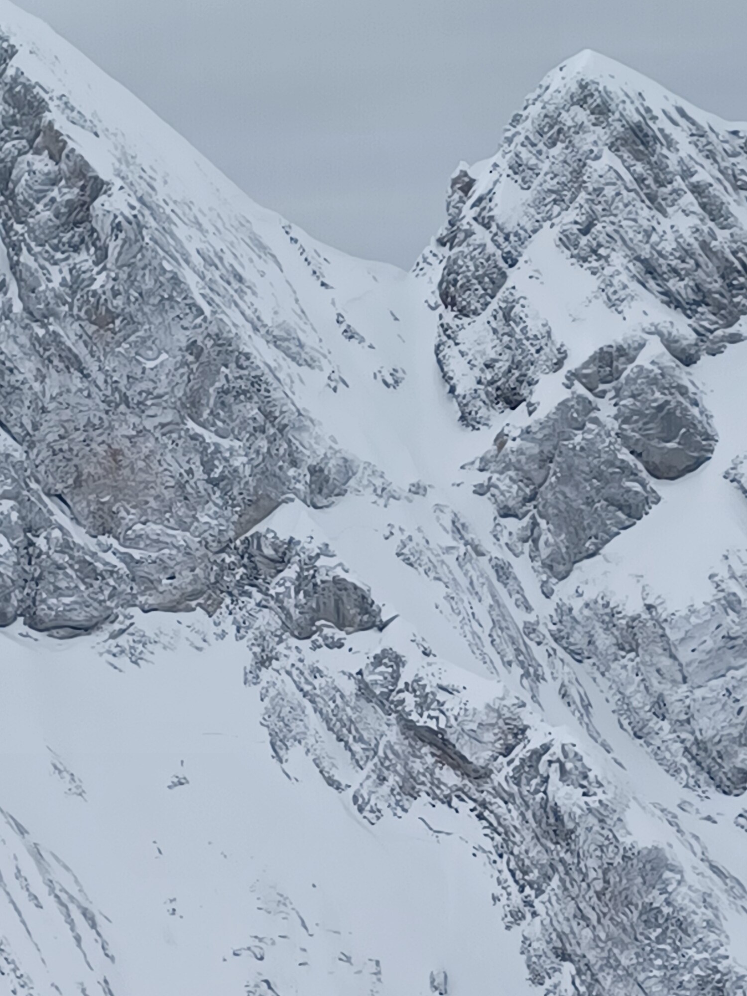 L´avalanche a balayé le couloir faisant ainsi apparaître les rochers rive droite à sa base, ce qui est une vision inhabituelle.