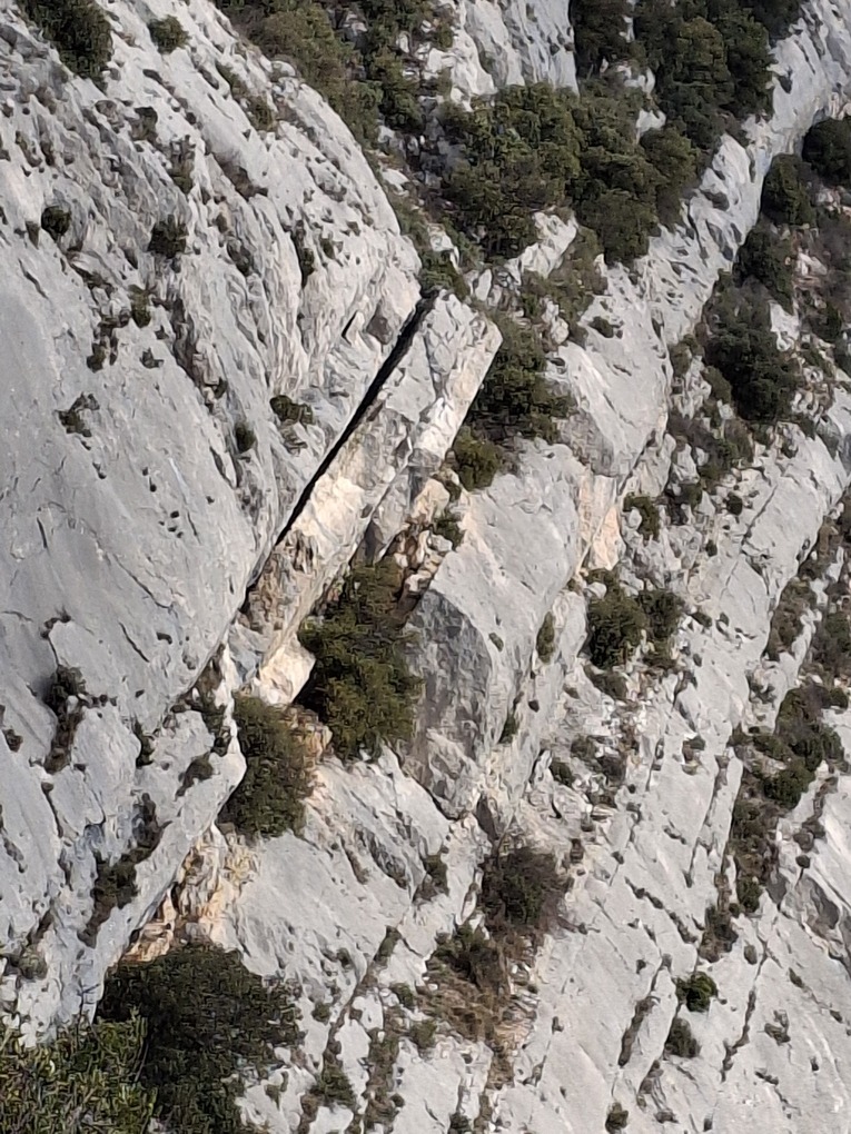 En refaisant les Cantilènes pour la première fois depuis quelques années le premier janvier j’ai jeté un oeil au Baou de Saint Antonin et j’ai eu l’oeil attiré par une fissure horizontale bien marquée dont je ne me rappelais pas. C’est mon cerveau qui me joue des tours, le fait que les fois précédentes j’étais trop occupé à essayer de suivre les bourrins devant moi pour regarder le paysage, ou il y a effectivement un bout de cailloux qui évolue inexorablement vers le divorce d’avec la falaise?