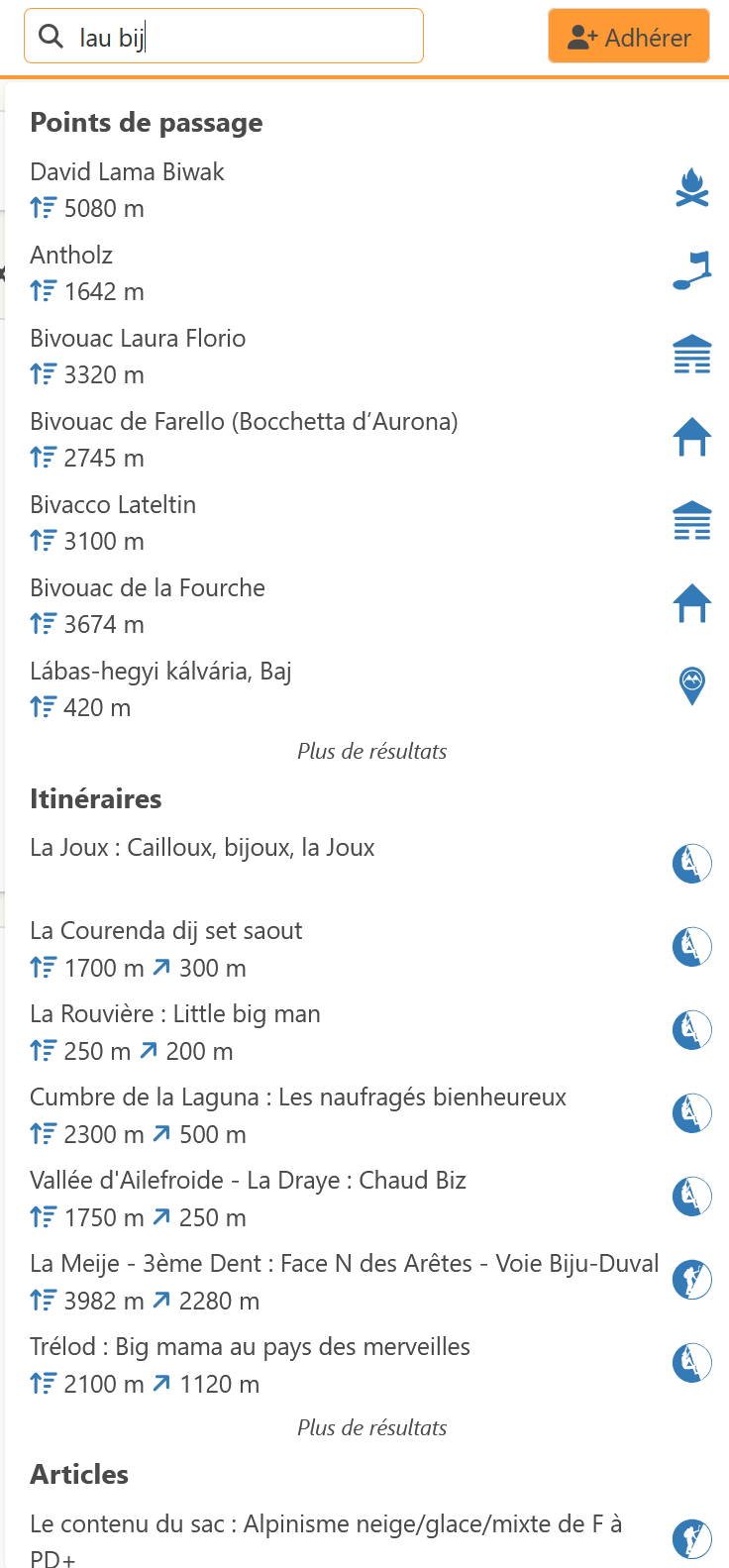 en tapant uniquement « Lau Bij » on ne trouve pas ce topo (probablement parce que Elastic Search cherche les termes « la » et « bi » (?) et donc retourne des trucs du style « bivouac », « lama » etc.