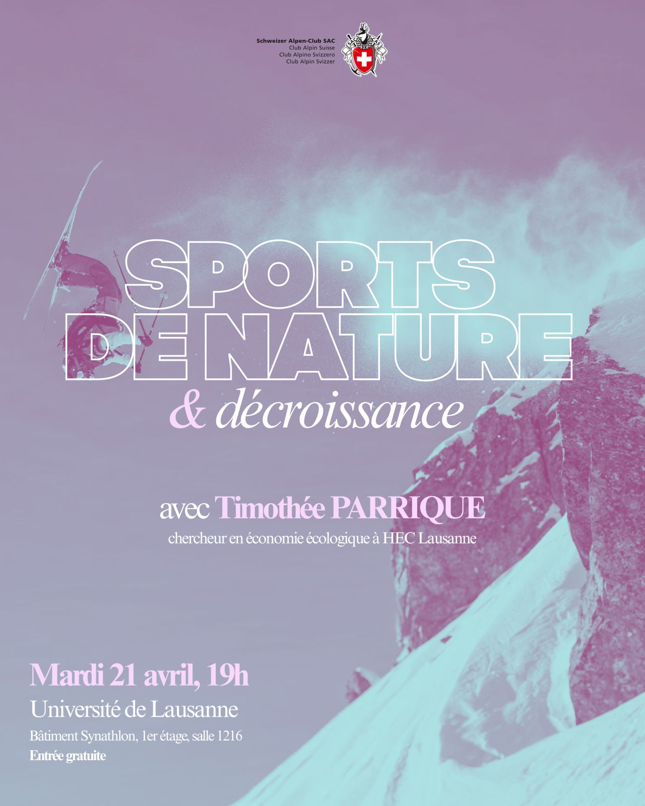 Thimothée Parrique donnera une conférence « Sports de nature et décroissance » à l’Université de Lausanne, le mardi 21 avril 2026 à 19h.