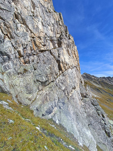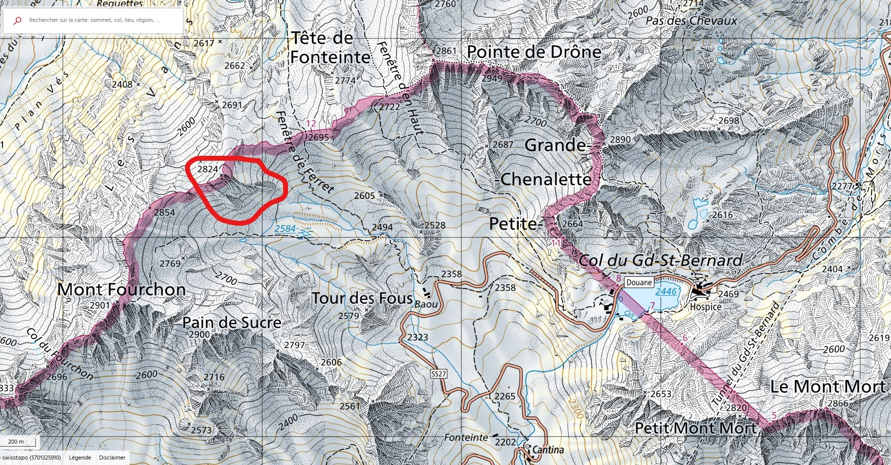 vers le Grand Saint Bernard, il y a des voies sur le pain de sucre, la tour des fous et le petit Cervin, mais j’ai remarqué aussi des voies sur le petit sommet coté 2824 m, que je ne trouve pas dans les divers topos du coin (Entremont, 8aBloc, val d’Aoste).