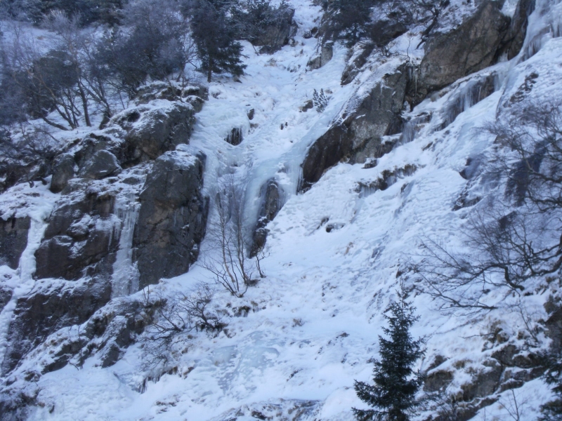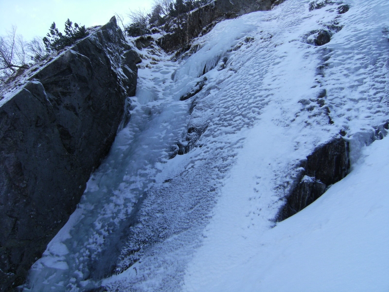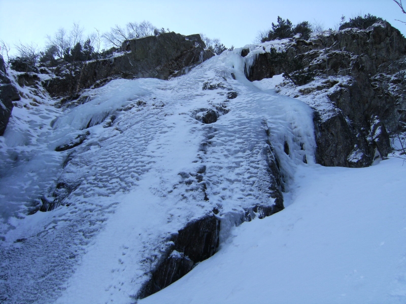Pour ma part j’irais bien là-bas demain matin, la glace est pas mal, j’ai vissé quelques broches et pas de bulle, le dièdre du bas est faisable en tête, il y a également une longueur de 50m faisable en moule du haut, pour le secteur du haut je n’ai pas regardé de près, mais le rideau de gauche avait l’air correct.
