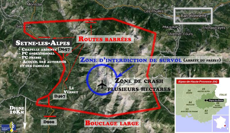 La Gendarmerie a posté sur son compte Twitter une carte des routes barrées autour du crash et des zones de recherches