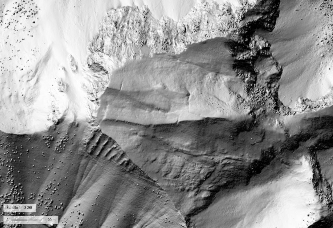 Une fois qu’on a réussi à trouver l’arrière plan, on ne trouve pas (carte IGN classique ou Plan) de cabane (elle parait héliportable) sur la zone supposée. J’ai eu l’idée de comparer la photo de l’énigme et ses petits reliefs du premier plan avec la carte Lidar. On les retrouve très bien. Il y a bien une différence entre MNT et MNS (voir la MNH), mais elle ne correspond pas à la forme d’une cabane. Travaux préparatoires à la pose ou arbuste ?
