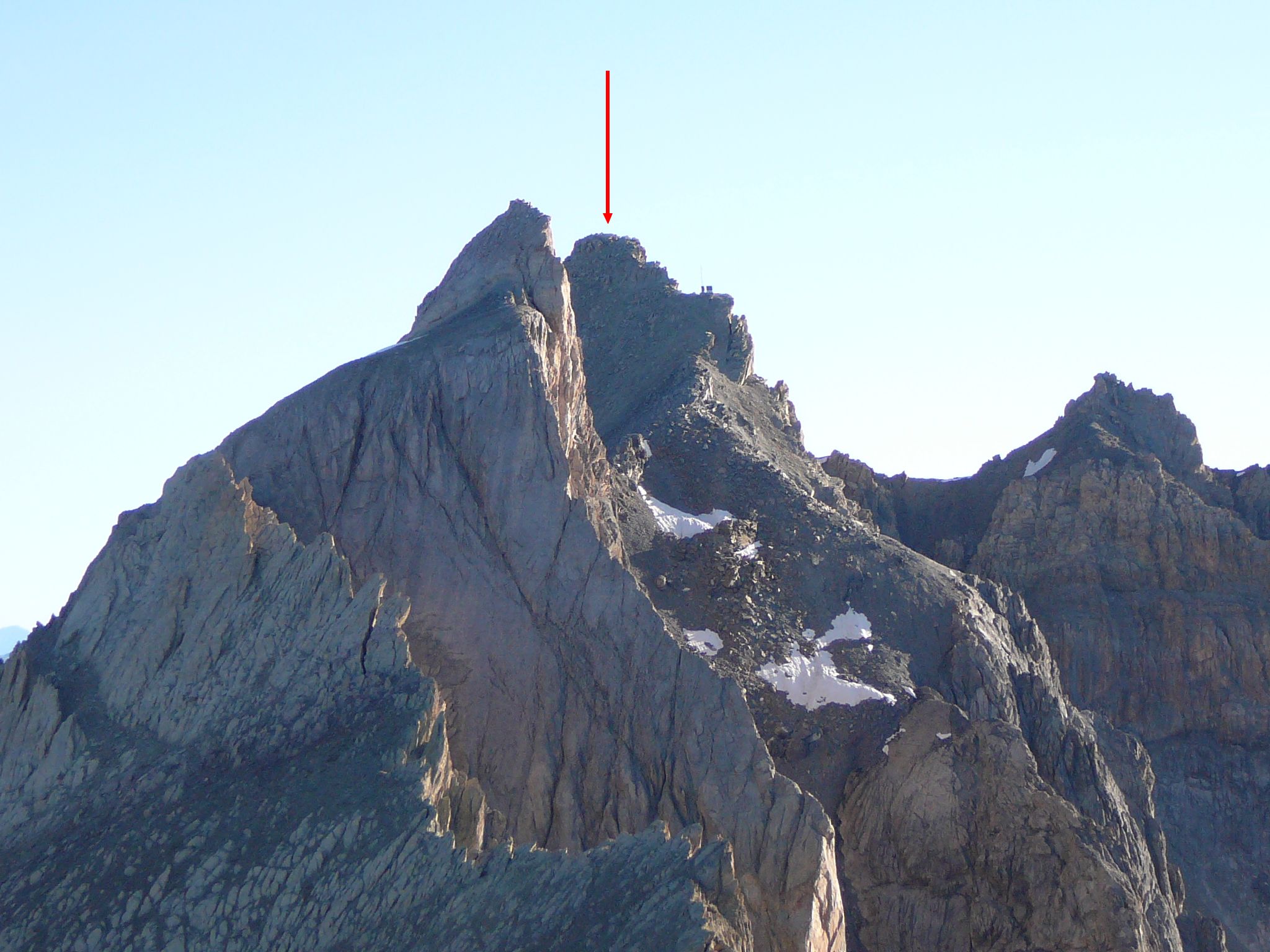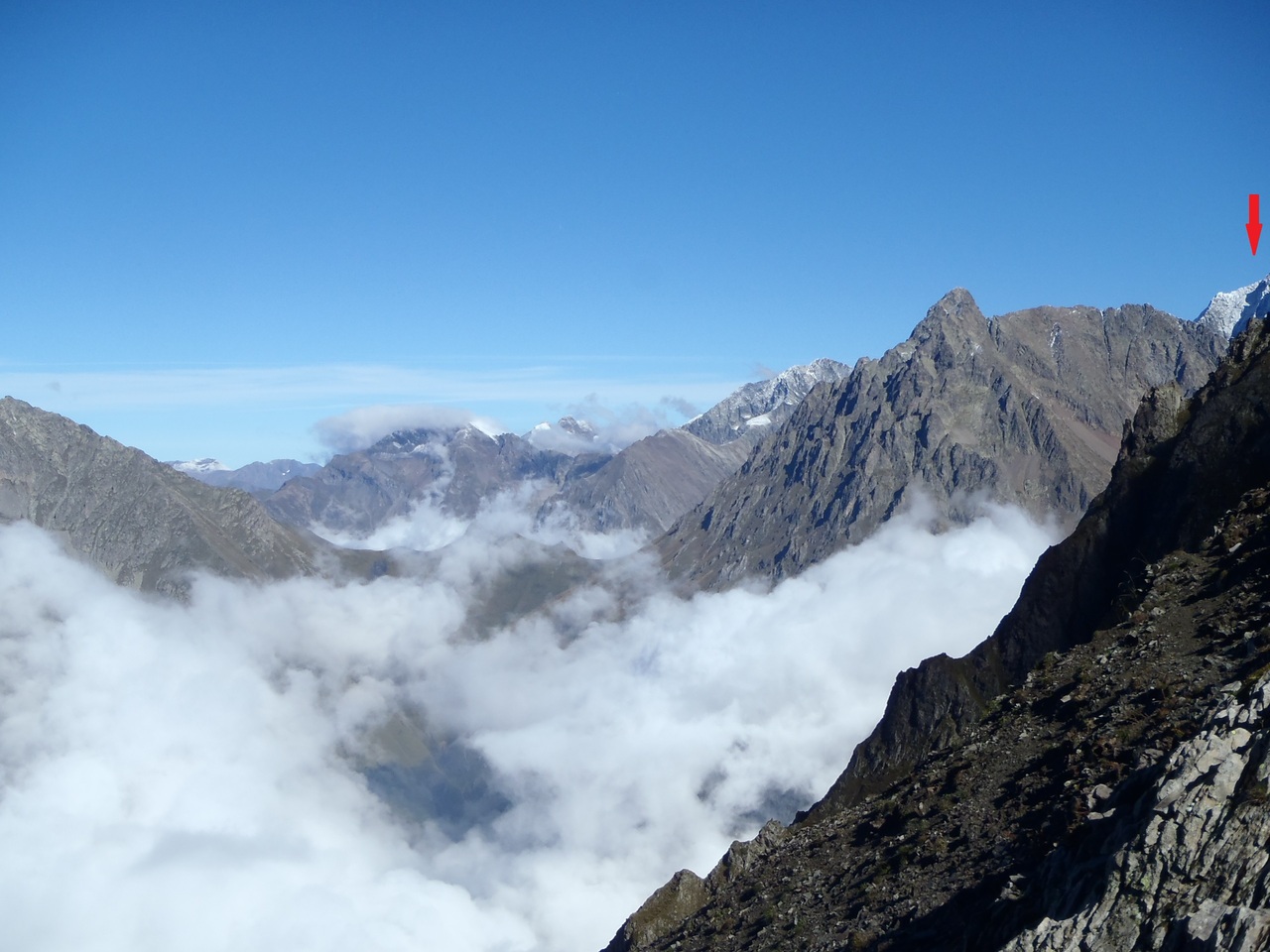 Quelle est la montagne avec de la neige tout à fait à droite ? Le point culminant est encore un peu plus à droite.