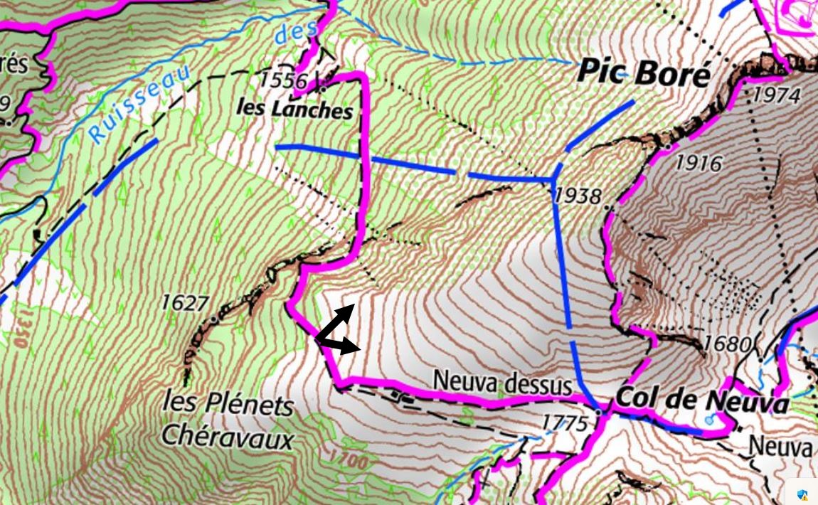 Sans vouloir te contredire, visité, allez disons deux cents fois… Je peux te dire que la pointe de ce triangle herbeux correspond bien à l’antécime, début de la crête pour aller au Pic Boré…