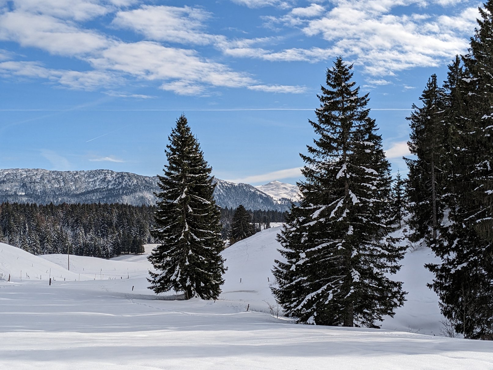 Donc on cherche le sommet bien blanc que l’on voit au loin entre les deux sapins.