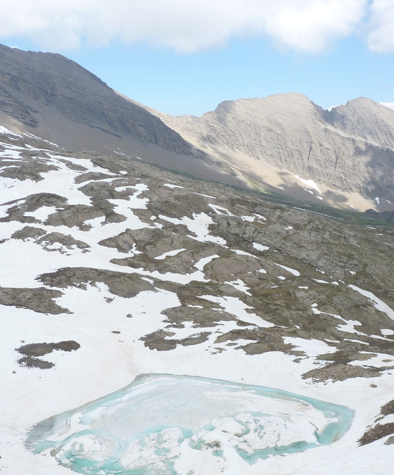 Une autre photo, prise durant la montée à la pointe des Rougnous. On voit le lac du Distroit, la baysse de Méan, le point 2779 et le 2785 de Chabeyret et la tête de Méan à l’ombre à gauche.