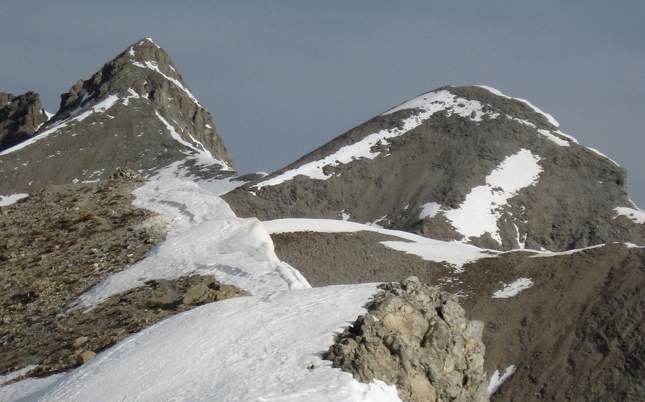 Entre les deux il y a le Col de la Petite Cayolle (invisible) et la crête neigeuse cotée 2865m (au second plan).