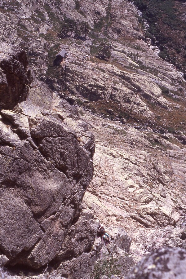 Ce n’est pas l’angle de vue habituel quand on est sur le GR20. C’est pris quelque part dans la face est du Capu Tighiettu. On avait trouvé un topo succinct qu’on a essayé de suivre sans guère de succès dans cette belle face de 600 m. On est quand même parvenus au sommet.
