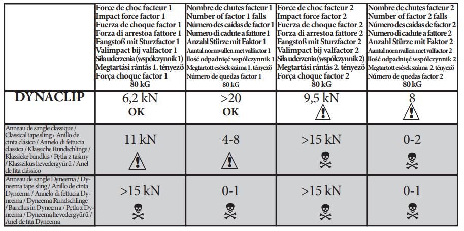 Les longes sont en corde dynamique et résistent bien à des chutes de facteur 1, voire 2 (il ne faut pas chuter sur une longe toutefois).