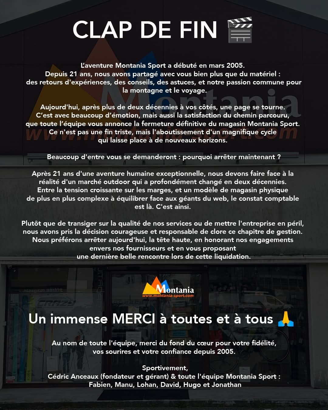 Avec plus de 110 000 clients fidèles, nous ne pourrons malheureusement pas répondre à vos appels téléphoniques pendant la préparation ou la liquidation. Pour toute question, contactez-nous par e-mail à info@montania-sport.com