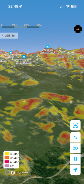 « les cartes de pente sont pourries et inexploitables en l’état ». Voilà c’est plus simple de dire les choses directement, sans détour. Et pour la 3D c’est joli mais pas ouf/exploitable pour du concret, en montagne. Bon je ne suis pas très objectif, à part pomper des infos à droite à gauche, je ne vois pas vraiment d’intérêt à cette appli.