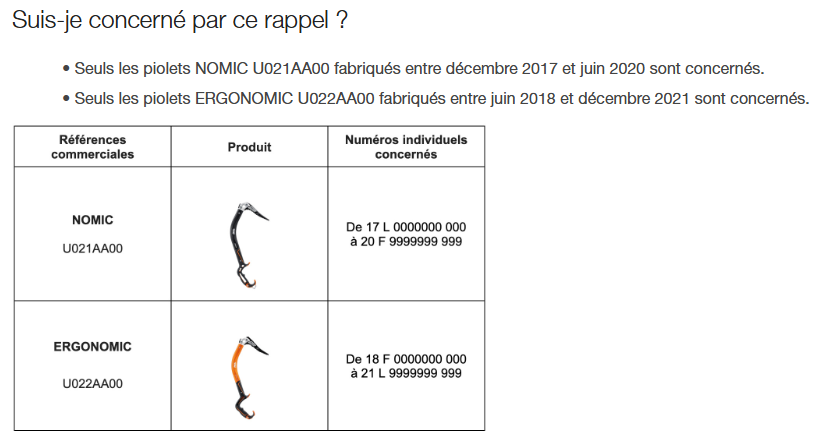 Suite à risque de casse de la poignée sur les premières années de fabrication de la génération actuelle de piolets NOMIC et ERGONOMIC, Petzl effectue un rappel produit sur les lots concernés.