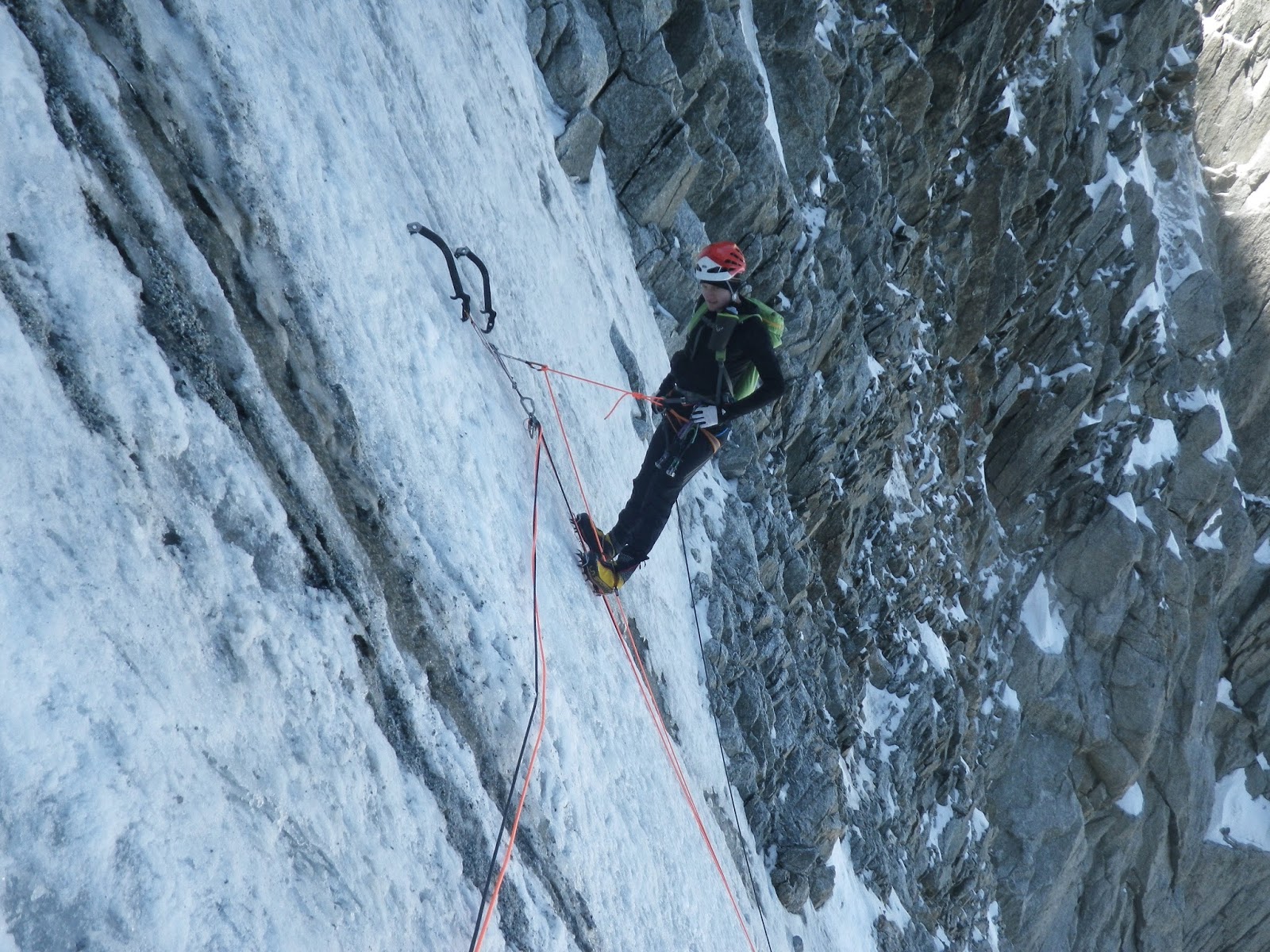 J’ai entendus je ne sait plus trop où qu’un piolet bien enfoncé dans de la bonne glace peut tenir jusqu’à une force de 200kg max. Je ne sait pas si c’est vrais ou pas, mais en tout cas c’est pas pire qu’une broche seule.