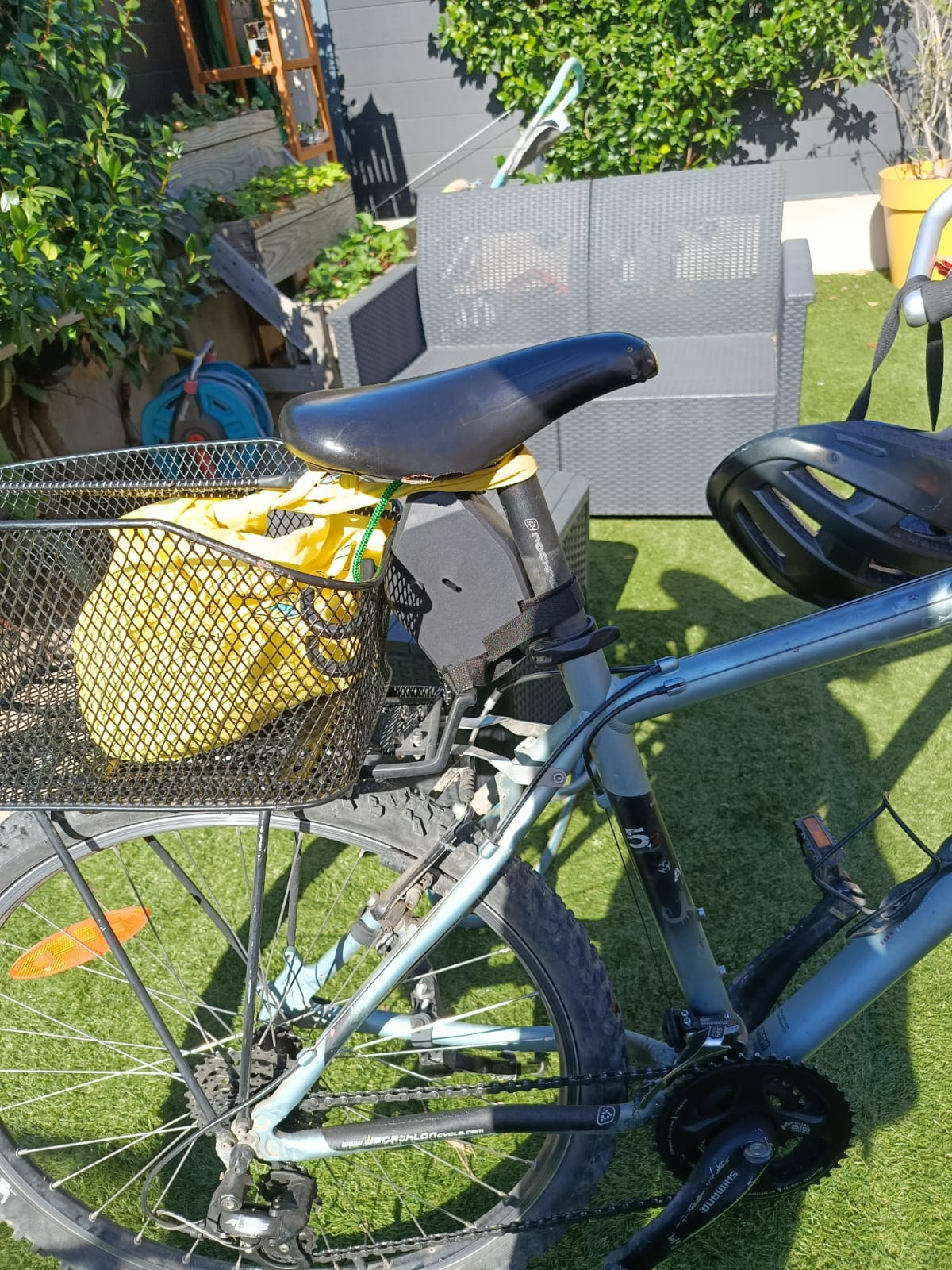 J’ai maintenant un panier arrière très pratique pour poser le barda (courses / affaires du môme / etc), et une petite sacoche avant pour les bricoles perso (lunettes de soleil / accessoires prothèse / téléphone).