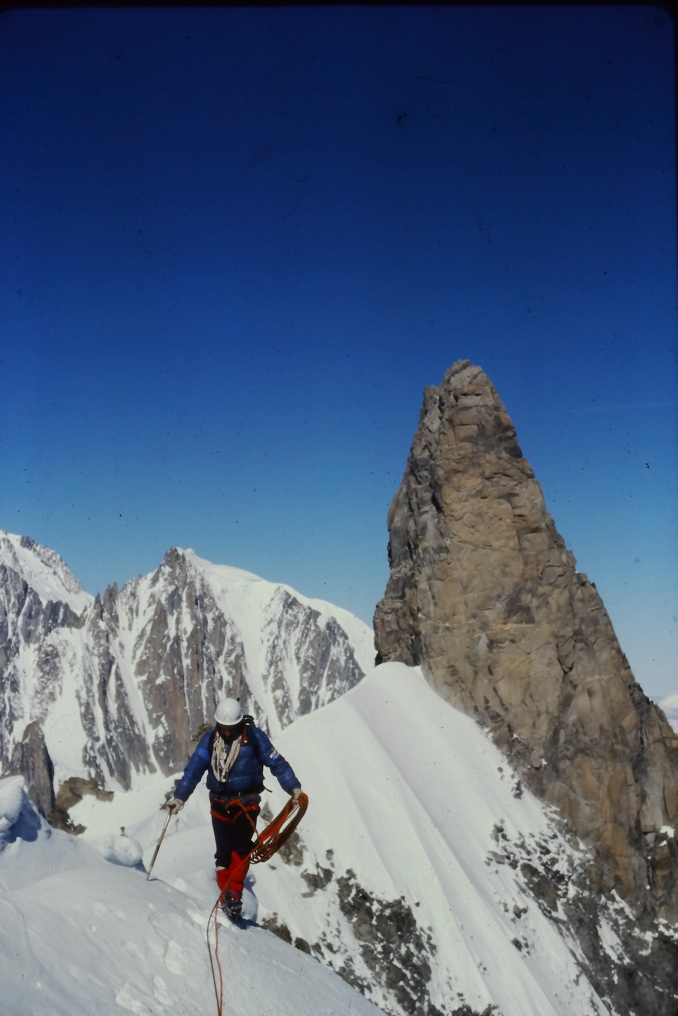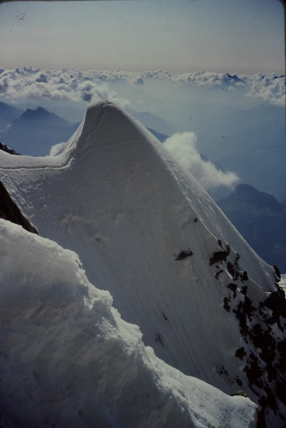 J’ai dépoli un morceau de verre au papier de verre et pris une diapo en photo avec mon objectif 100 macro, la diapo posée sur le verre lui-même posé sur une lampe. J’ai des améliorations à faire ( j’ai utilisé une lampe de chevet il faut que je bricole un truc pour la lumière du jour) et surtout je ne suis pas vraiment perpendiculaire à la diapo d’où des petits problèmes de déformation (aucune importance) et surtout de netteté inégale. MAIS c’est quand même pas mal. Cette photo a été prise en août 93 ( et accessoirement montre qu’à cette époque avec notre vieux matos on pouvait faire des photos plaisantes), les conditions doivent être bien différentes maintenant. Vous reconnaissez bien entendu la Kuffner (faite au départ de Torino et jusqu’au sommet du Maudit le lendemain de cette photo, elle-même prise au lever du jour en allant à la Tour ronde)