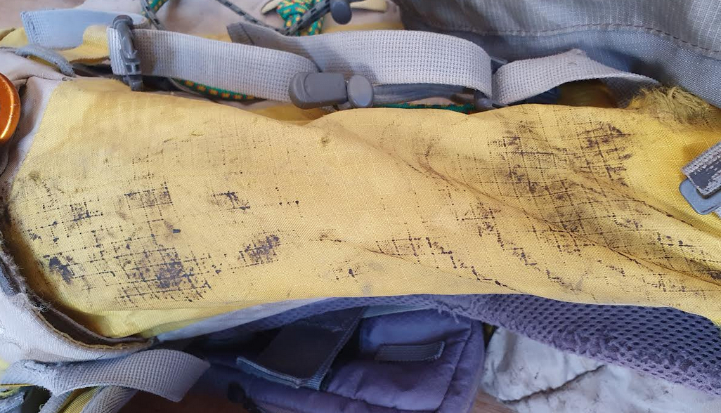 Mais nos semelles de ski sont rentrées toutes enduites d’une substance collante, qui ne part pas au chiffon. Et nos sacs à dos après portage tout noir à l’endroit où les spatules les touchaient… On pense donc à une pollution : dégazage d’un avion?