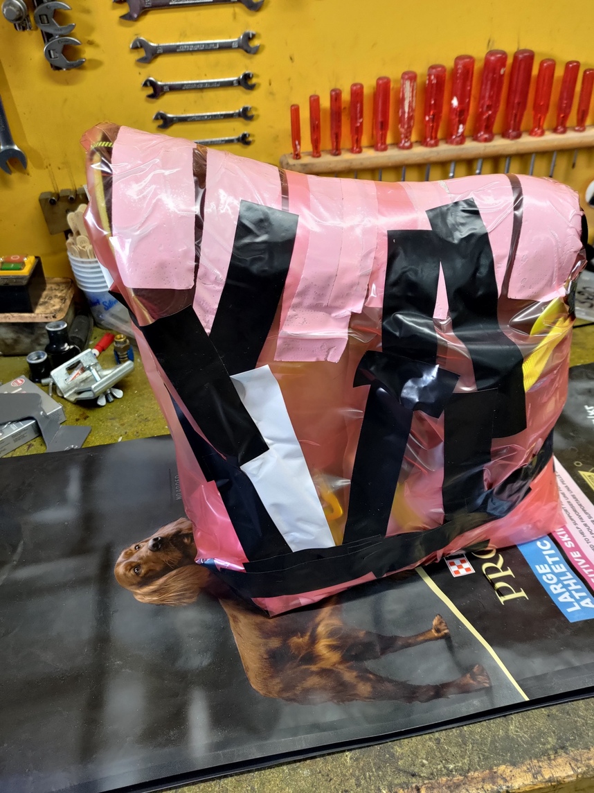 Mise en place d’un plastique bien étanche et fermé, pour que la résine ne vienne pas en contact avec la chaussure, et protection de l’établi (ok c’est un peu sur-protégé ici, la résine ne coulera pas tant que ça). Il faut que ce soit bien lisse sans pli, sinon ça se verra sur la 1ère couche de fibre.