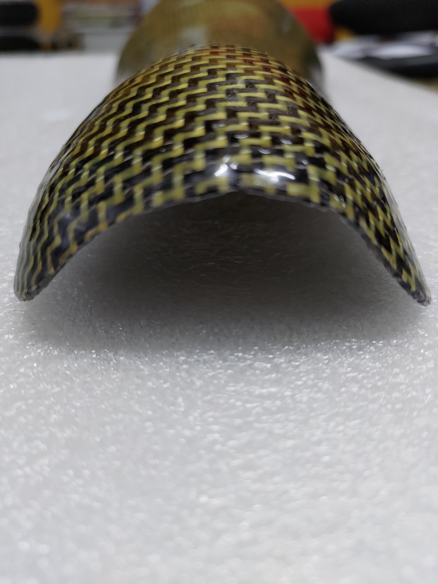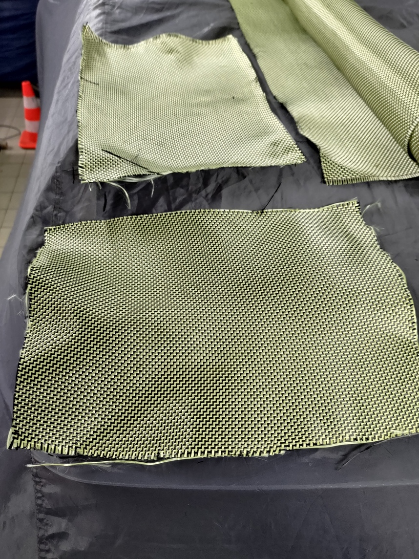 Le Kevlar (fibre d’aramide, jaune) est plus polyvalent, meilleur en amortissement/choc, mais ne supporte pas bien l’humidité (même si l’enveloppe de résine devrait protéger l’ensemble). Mais surtout je n’en avais pas en stock.