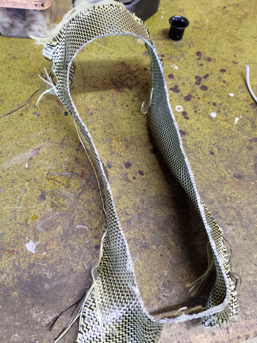 Donc je pris ce que j’avais, du mix carbone-kevlar à découper (au gros ciseau bien-mal affuté), qui devrait cumuler les 2 avantages et limiter les 2 inconvénients (oui, la théorie se manie comme ça m’arrange).