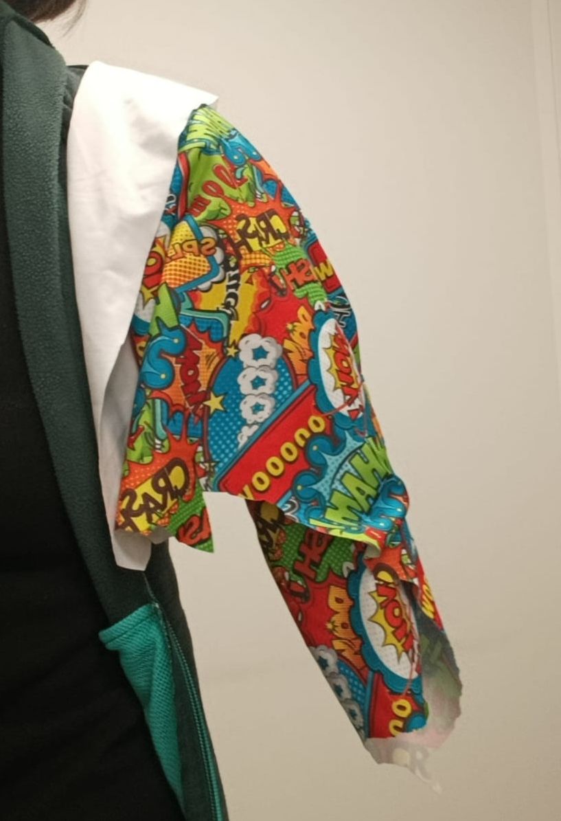 Tout ça pour ça : en fait la prothésiste avait déjà envoyé l’impression avec un tissu multicolore qu’elle avait en stock !